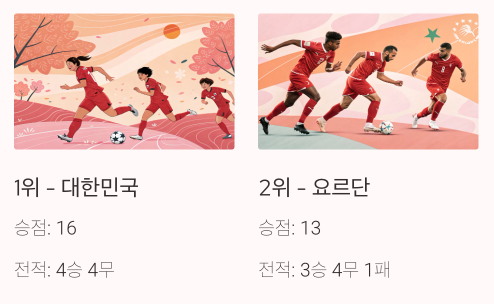 | 2 | 🇯🇴 요르단 | 13 | 3승 4무 1패 |