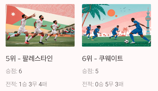 | 6 | 🇰🇼 쿠웨이트 | 5 | 0승 5무 3패 |