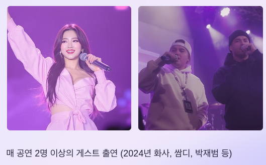 - 싸이 흠뻑쇼 게스트 라인업: 매 공연 2명 이상 (2024년엔 화사, 쌈디, 박재범 출연)