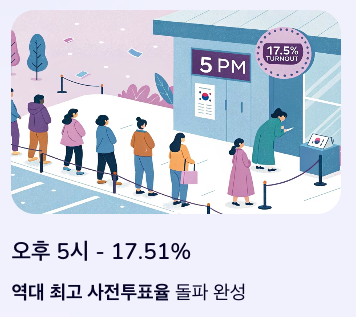 | 오후 5시 | 17.51% | 역대 최고 사전투표율 돌파 완성 |